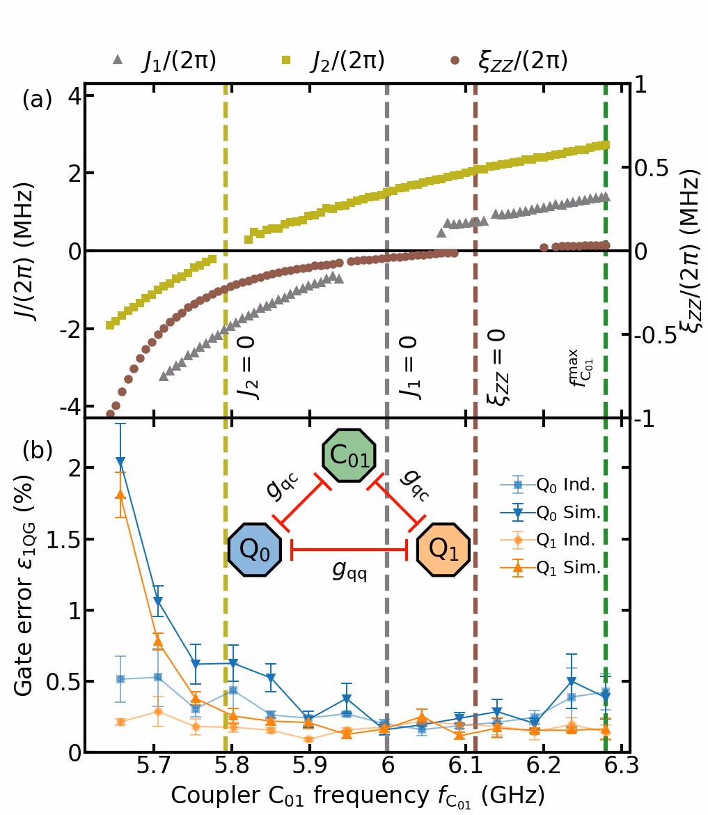 Single-qubit gates: Randomised benchmarking was used to track fidelity as a function of coupler frequency. A broad low-error region was observed near the ZZ = 0 point, with minima aligning with the suppression of exchange interaction J1.