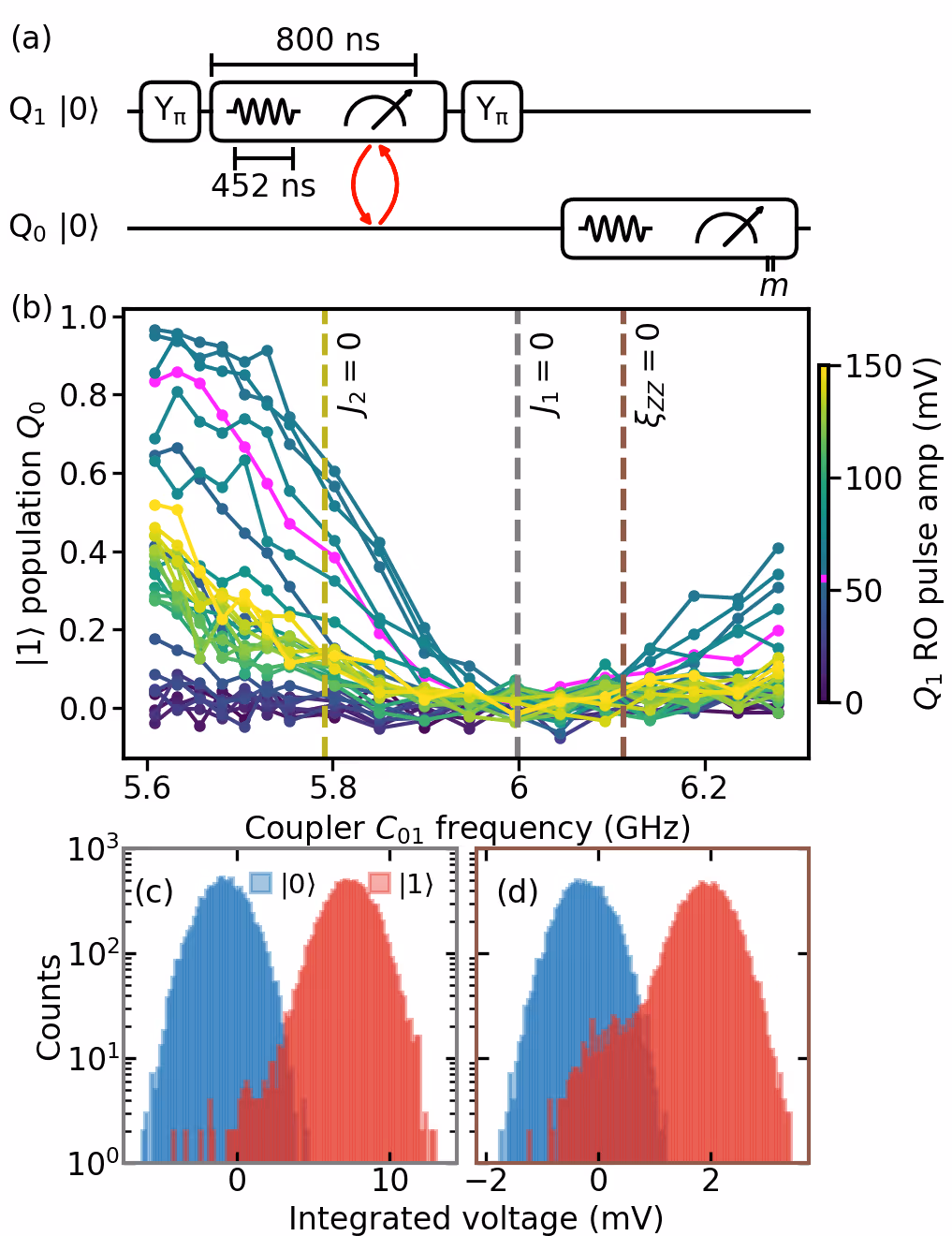Readout: Residual J1 coupling at the coupler ZZ-offpoint led to population exchange between qubits during measurement. The experiments showed this could be nullified by turning J1 ≈ 0, significantly improving readout fidelity.