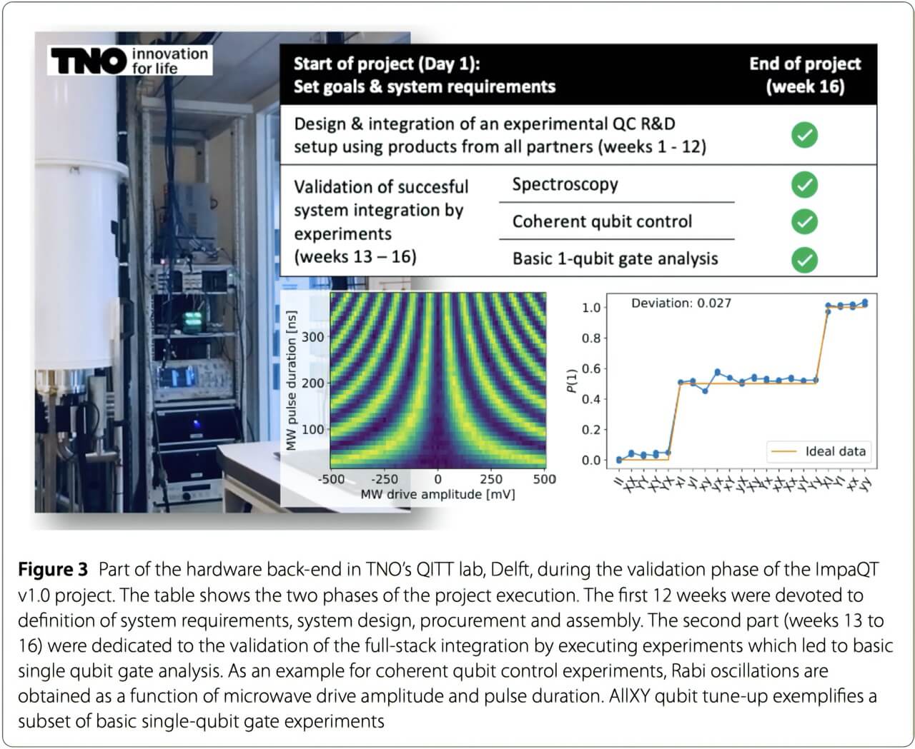 One of the key propositions put forward in Sect. 2.2 was to tackle the question of accelerating quantum computing R&D efforts in a collaborative way – by involving independent commercial partners which can leverage their individual strengths, thereby mitigating the risks involved. Following this logic, a four-month-long project called ImpaQT was initiated by companies of the Dutch quantum ecosystem. These companies form a local supply chain for the following off-the-shelf key components: (i) Algorithms to solve a specific problem that is likely to be solved efficiently on a quantum computer, (ii) software to characterise, calibrate and run algorithms on the quantum device, (iii) electronics to enable closed loop control of the quantum device, (iv) cabling and filtering that is scalable to control a multi-qubit quantum device, and (v) multi-qubit Trasmon-based quantum processors.