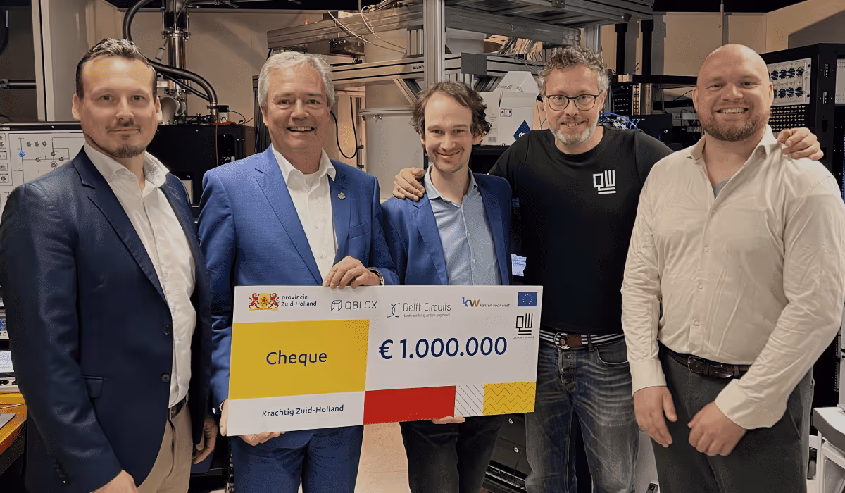 From left to right - Eric Kievit (COO, Qblox); Meindert Stolk (Deputy of Economy and Innovation in South Holland); Damaz de Jong (Roadmap Leader, Qblox), Alessandro Bruno (Co-founder & CTO, QuantWare); Marc de Voogd (Quantum Systems Engineer, Delft Circuits)